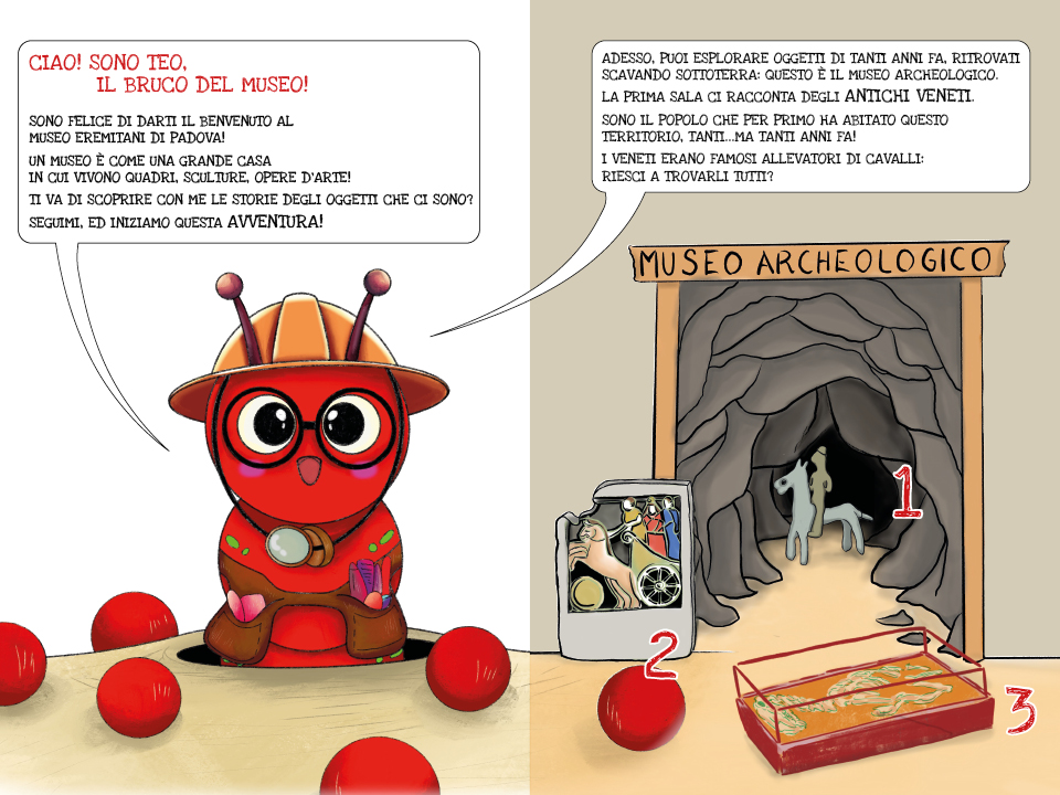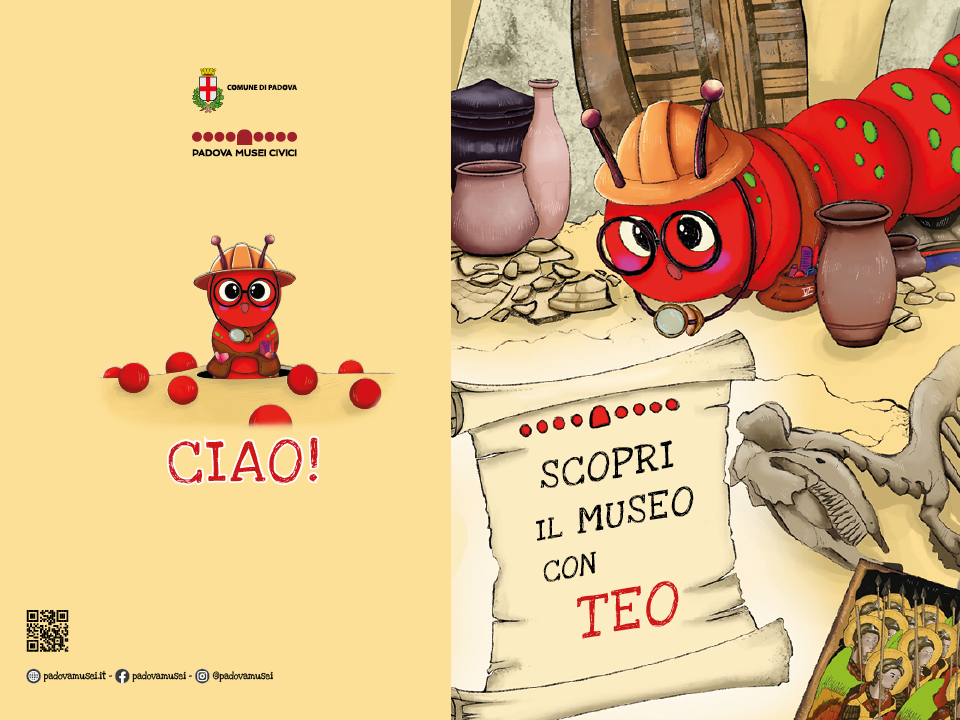 L'albo illustrato "Scopri il Museo con Teo" è stato pensato per aiutare i bambini dai 3 ai 6 anni ad esplorare il Museo Eremitani di Padova. La visita attraverso questo strumento è immaginata come un’avventura, letta dagli adulti, in cui i piccoli sono accompagnati dalla mascotte Teo il bruco del Museo.